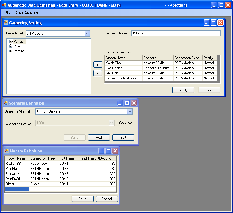 نرم افزار دارای قابلیت ذخیره نقطه، خط و محدوده به عنوان ایستگاه می باشد بطوریکه هرکدام می توانند در گام های زمانی (دقیقه ایی، ساعتی، روزانه و …) داده ها را در زیر مجموعه های مختلف خود ( بارش، تبخیر، تراز آب و …) ذخیره کنند.
